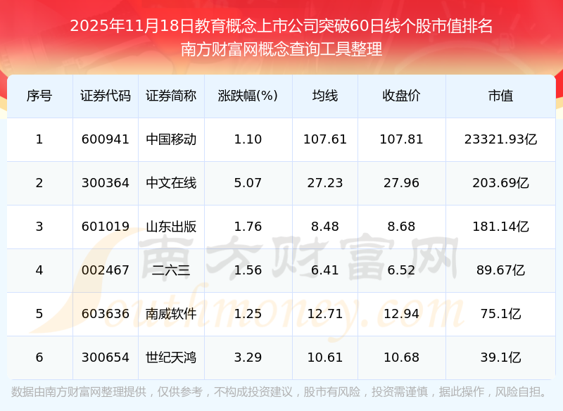 根据开云手机web版登录入口概念查询工具数据统计,截止2025年11月18日收盘,教育概念上市公司共有6只个股收盘价向上突破了60日线。其中市值较大的个股有中国移动、中文在线、山东出版等,市值分别为23321.93亿、203.69亿、181.14亿。