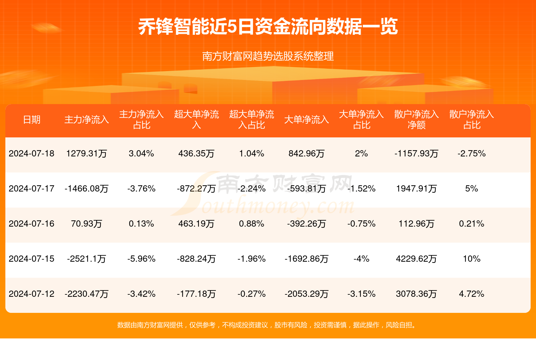 7月18日消息,乔锋智能主力净流入1279.31万元,超大单净流入436.35万元,散户净流出1157.93万元。