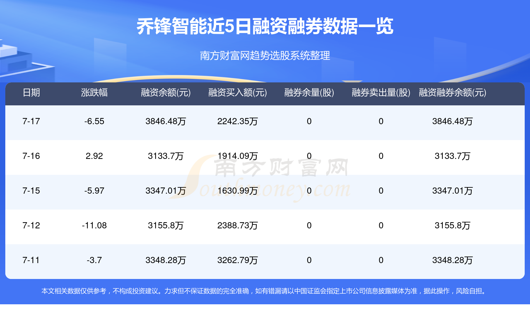 7月17日乔锋智能融券信息显示,融资方面,当日融资买入2242.35万元,融资偿还1529.57万元,融资净买额712.78万元。近5日融资融券数据一览见下表: