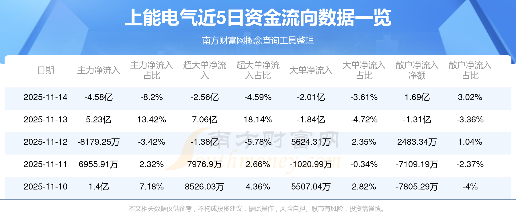 11月14日消息,上能电气11月14日主力净流出4.58亿元,超大单净流出2.56亿元,大单净流出2.01亿元,散户净流入1.69亿元。