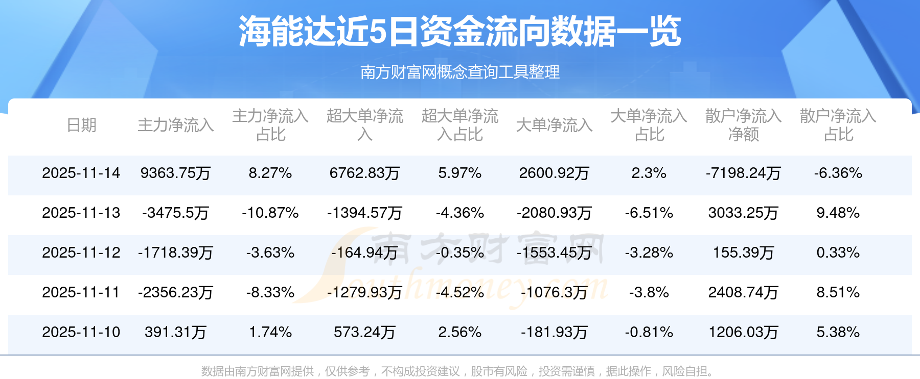 11月14日消息,海能达资金净流入9363.75万元,超大单资金净流入6762.83万元,换手率7.43%,成交金额11.32亿元。