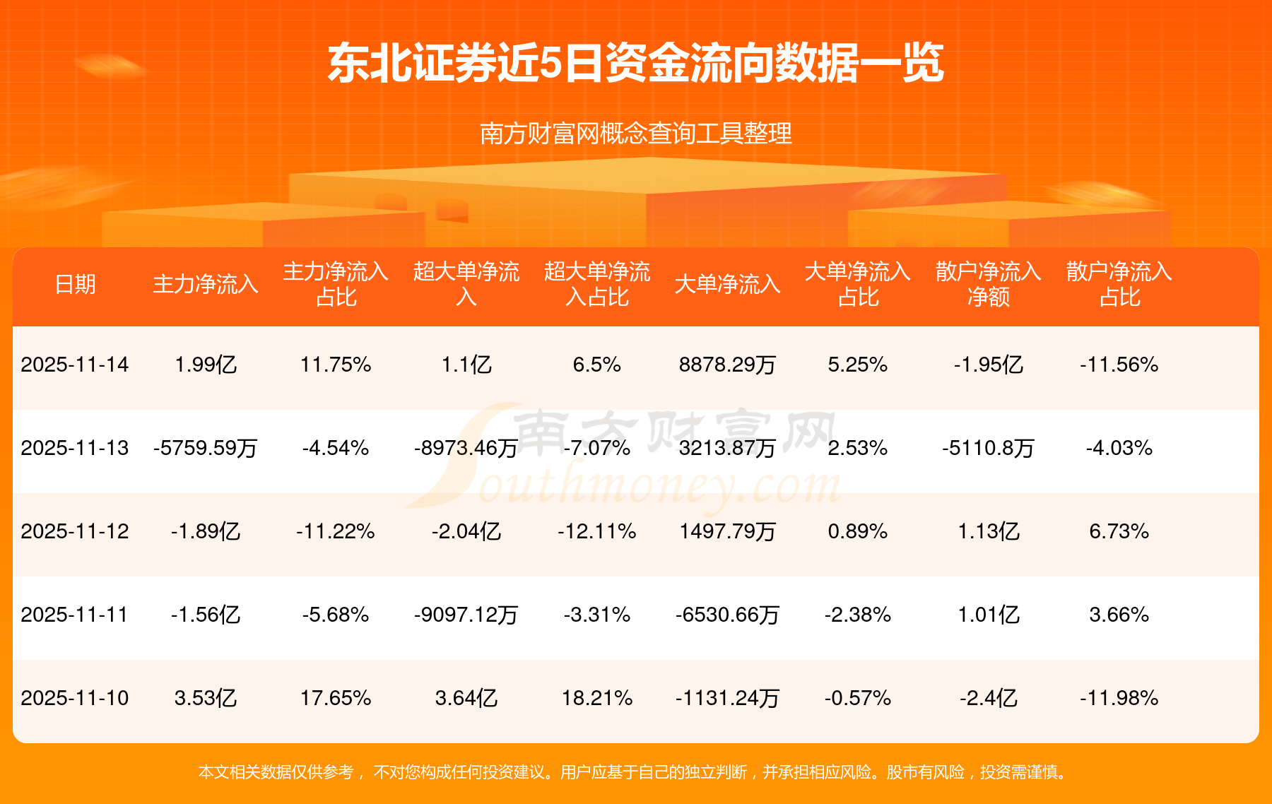 11月14日消息,东北证券主力净流入1.99亿元,超大单净流入1.1亿元,散户净流出1.95亿元。