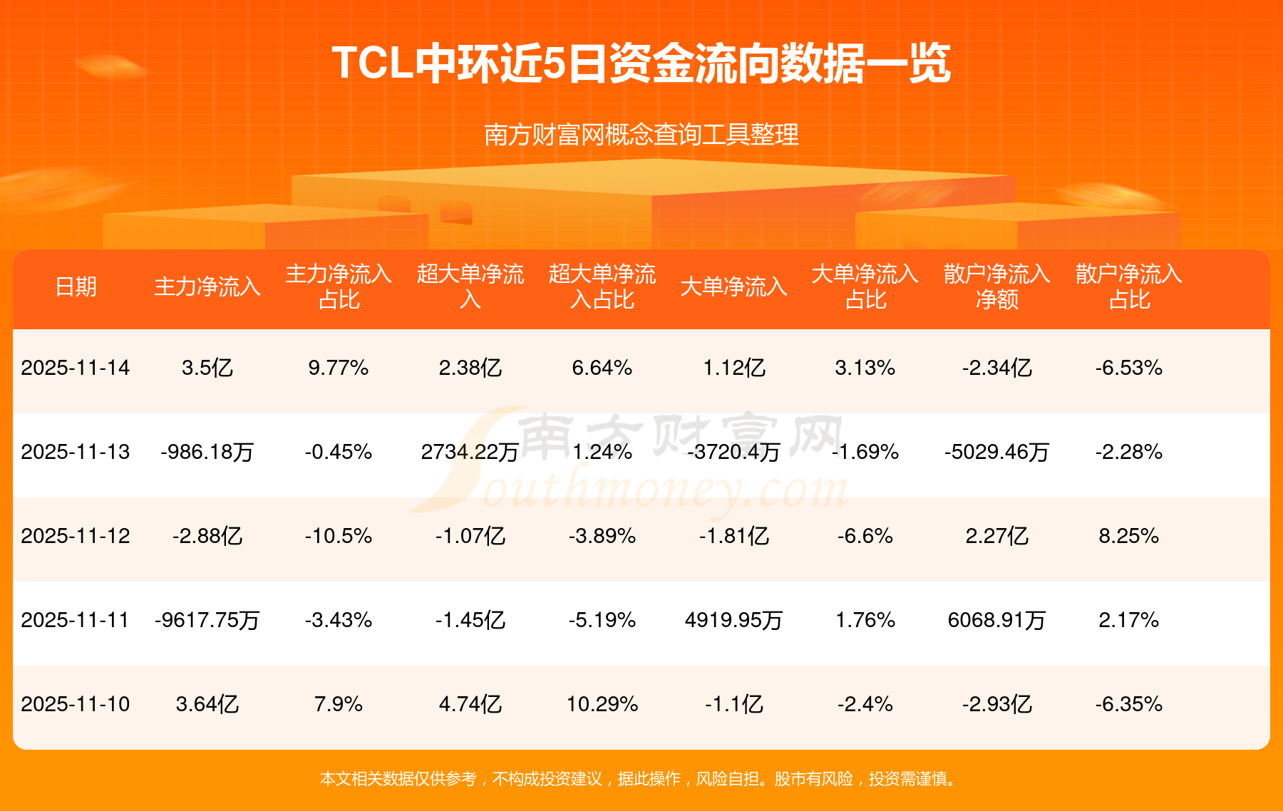 11月14日消息,TCL中环11月14日主力资金净流入3.5亿元,超大单资金净流入2.38亿元,大单资金净流入1.12亿元,散户资金净流出2.34亿元。