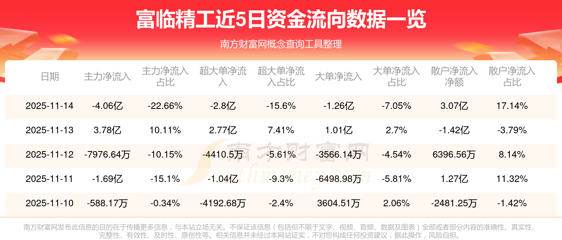 11月14日消息,富临精工11月14日主力资金净流出4.06亿元,超大单资金净流出2.8亿元,大单资金净流出1.26亿元,散户资金净流入3.07亿元。