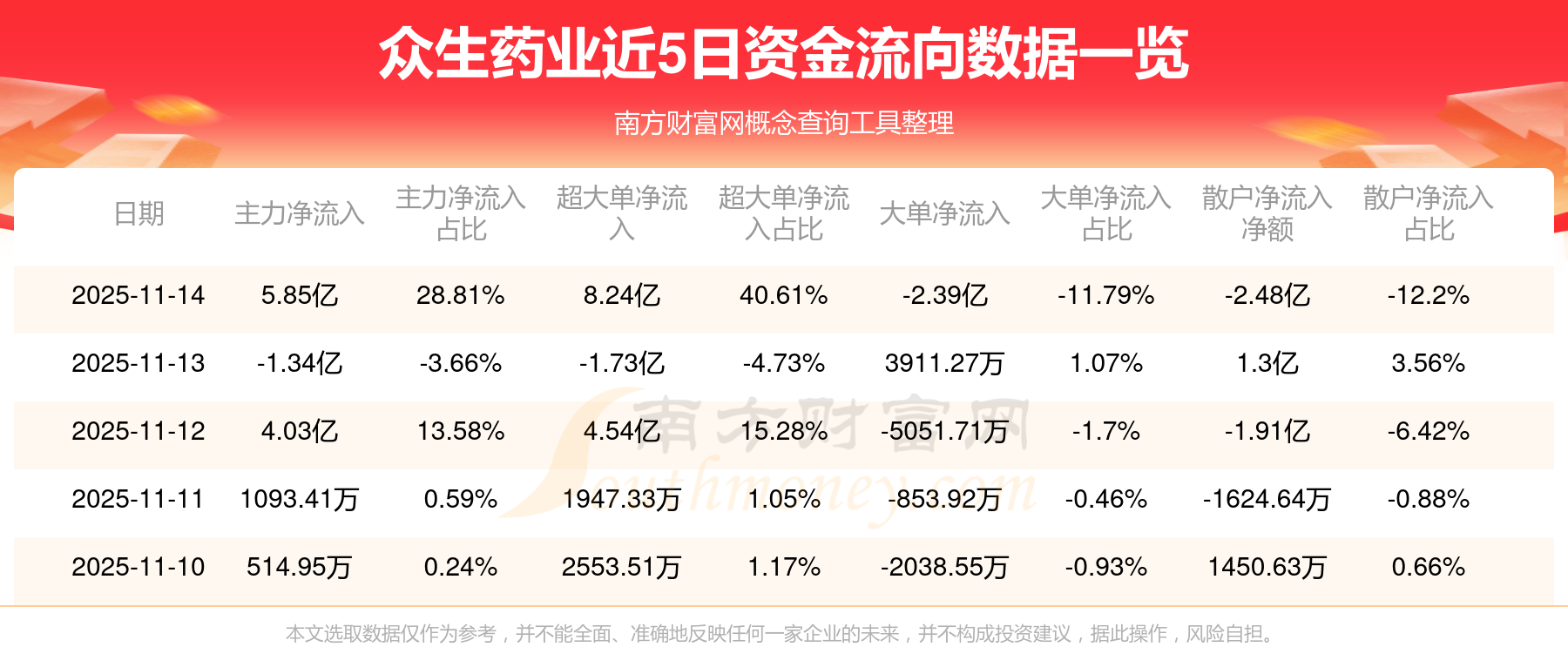11月14日消息,众生药业主力净流入5.85亿元,超大单净流入8.24亿元,散户净流出2.48亿元。