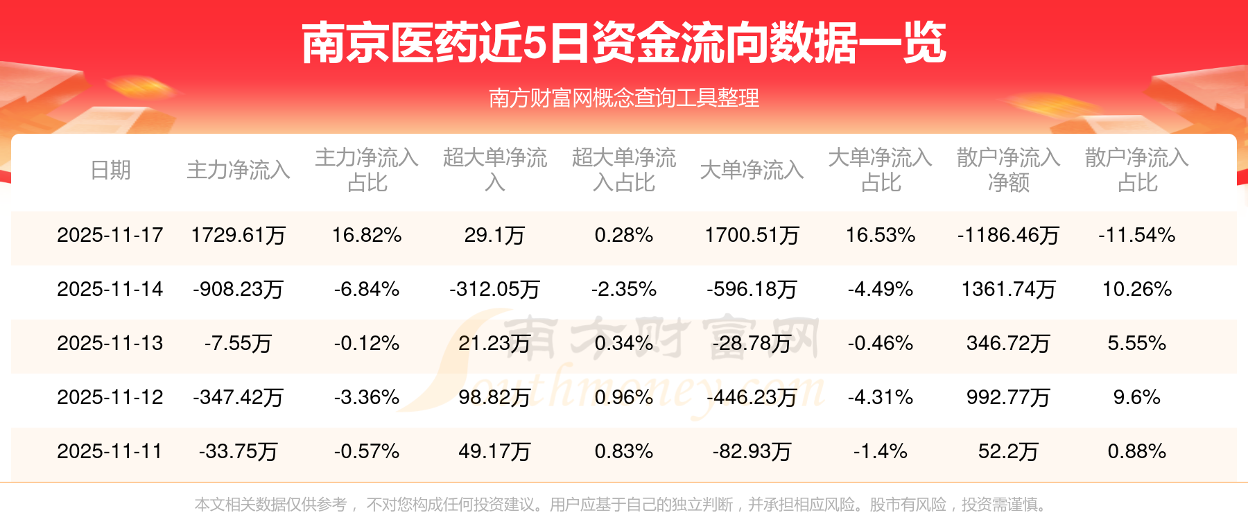11月17日消息,南京医药主力净流入1729.61万元,超大单净流入29.1万元,散户净流出1186.46万元。