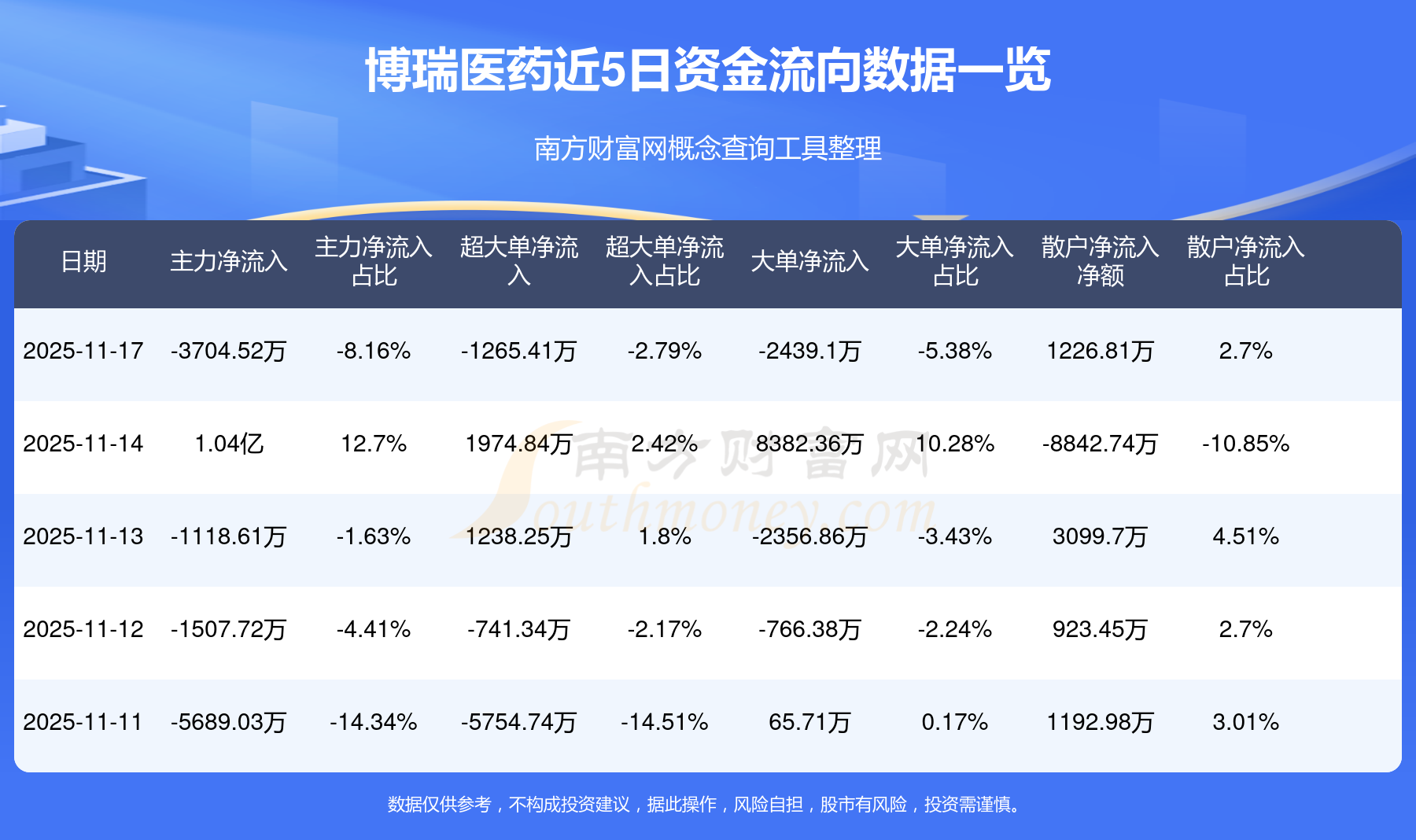 11月17日消息,博瑞医药资金净流出3704.52万元,超大单资金净流出1265.41万元,换手率2.01%,成交金额4.54亿元。