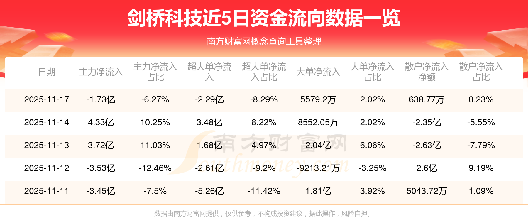 11月17日消息,剑桥科技11月17日主力资金净流出1.73亿元,超大单资金净流出2.29亿元,大单资金净流入5579.2万元,散户资金净流入638.77万元。