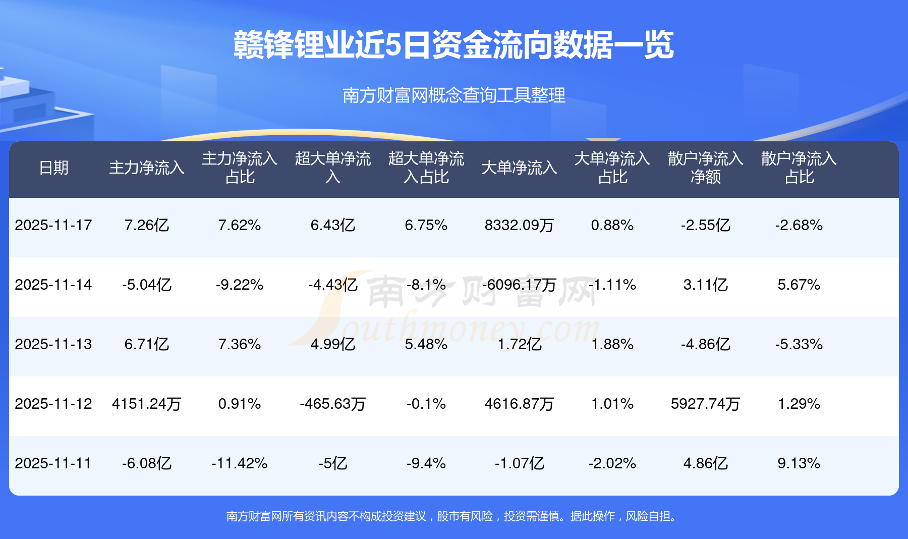 11月17日消息,赣锋锂业主力资金净流入7.26亿元,超大单资金净流入6.43亿元,散户资金净流出2.55亿元。