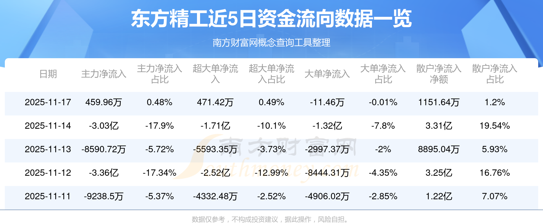 11月17日消息,东方精工主力资金净流入459.96万元,超大单资金净流入471.42万元,散户资金净流入1151.64万元。