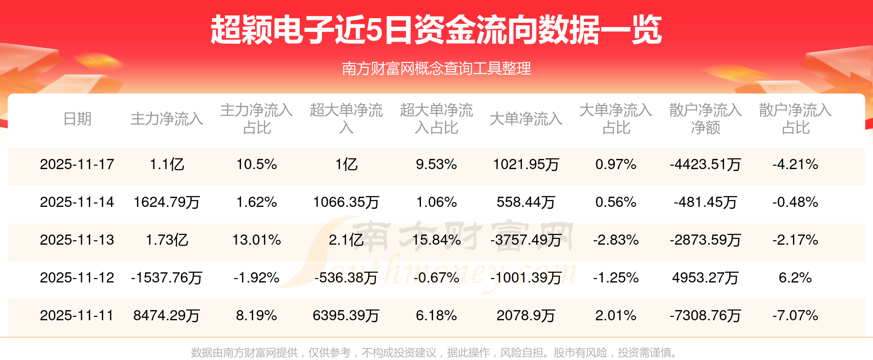 11月17日消息,超颖电子11月17日主力资金净流入1.1亿元,超大单资金净流入1亿元,大单资金净流入1021.95万元,散户资金净流出4423.51万元。