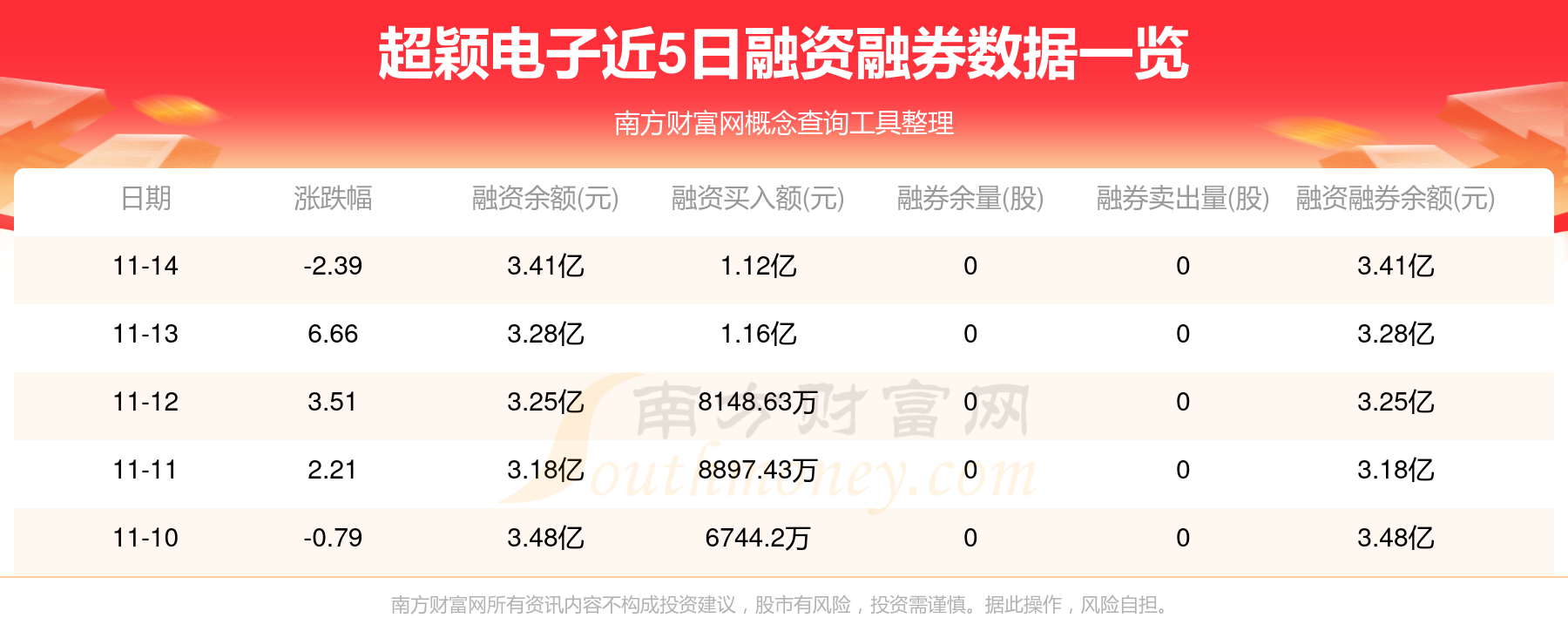 超颖电子11月14日融券信息显示,融资方面,当日融资买入1.12亿元,融资偿还9940.04万元,融资净买额1298.51万元。近5日融资融券数据一览见下表: