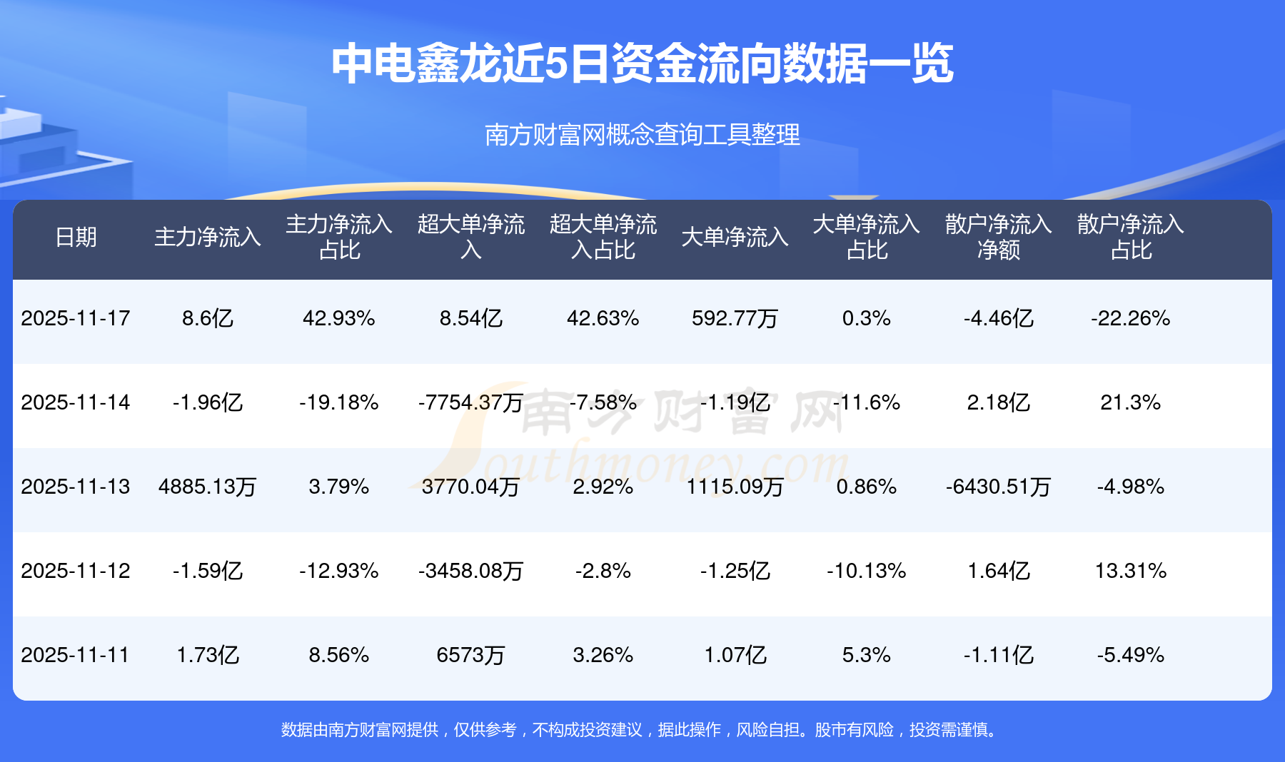 11月17日消息,中电鑫龙资金净流入8.6亿元,超大单资金净流入8.54亿元,换手率23.07%,成交金额20.02亿元。