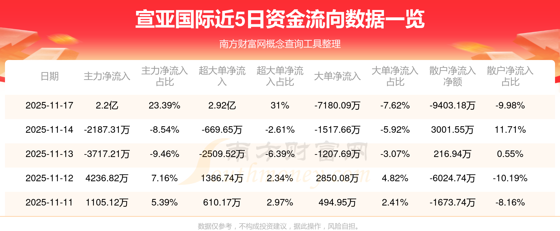 11月17日消息,宣亚国际11月17日主力净流入2.2亿元,超大单净流入2.92亿元,大单净流出7180.09万元,散户净流出9403.18万元。