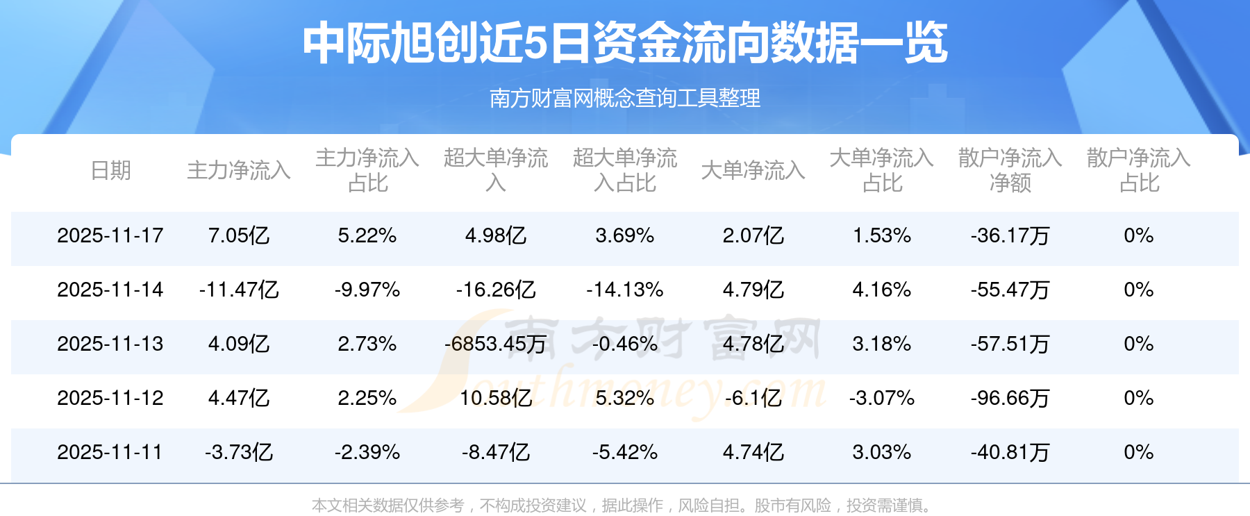 11月17日消息,中际旭创主力净流入7.05亿元,超大单净流入4.98亿元,散户净流出36.17万元。