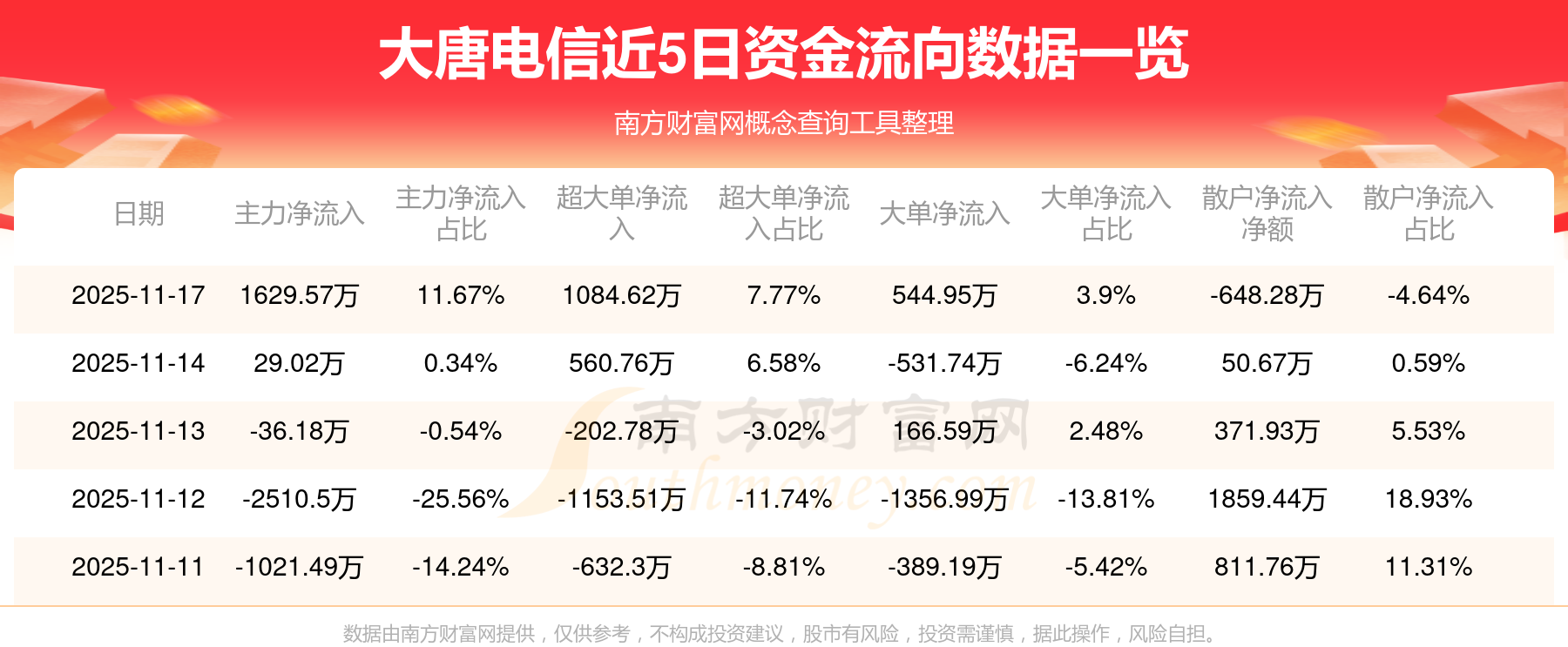 11月17日消息,大唐电信主力资金净流入1629.57万元,超大单资金净流入1084.62万元,散户资金净流出648.28万元。