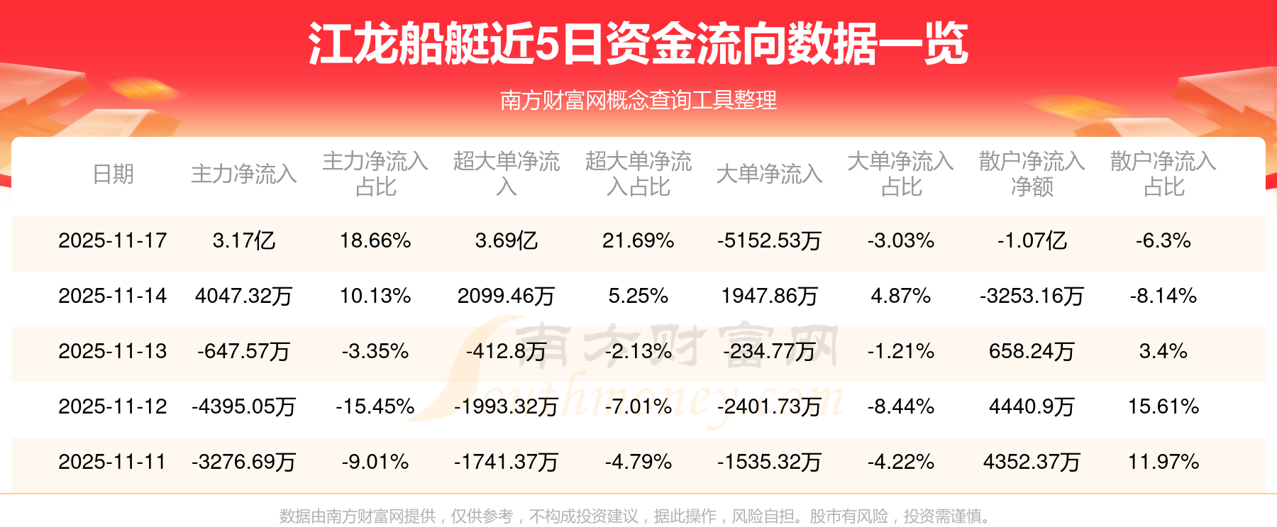 11月17日消息,江龙船艇主力资金净流入3.17亿元,超大单资金净流入3.69亿元,散户资金净流出1.07亿元。