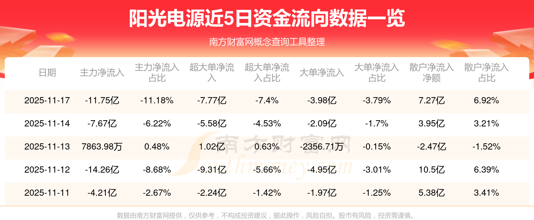 11月17日消息,阳光电源11月17日主力资金净流出11.75亿元,超大单资金净流出7.77亿元,大单资金净流出3.98亿元,散户资金净流入7.27亿元。