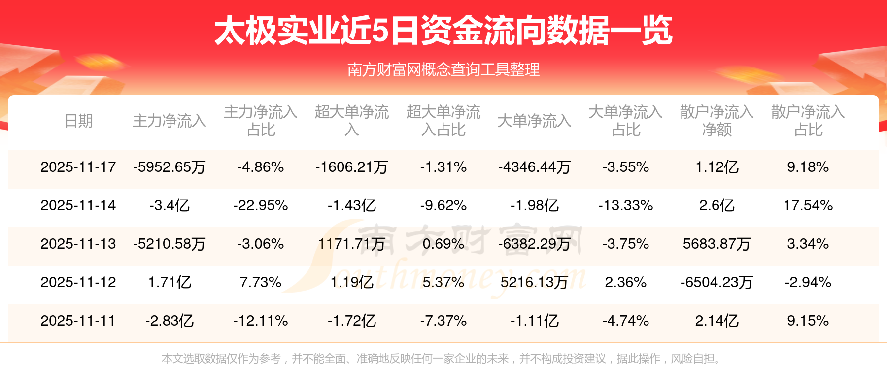 11月17日消息,太极实业主力净流出5952.65万元,超大单净流出1606.21万元,散户净流入1.12亿元。