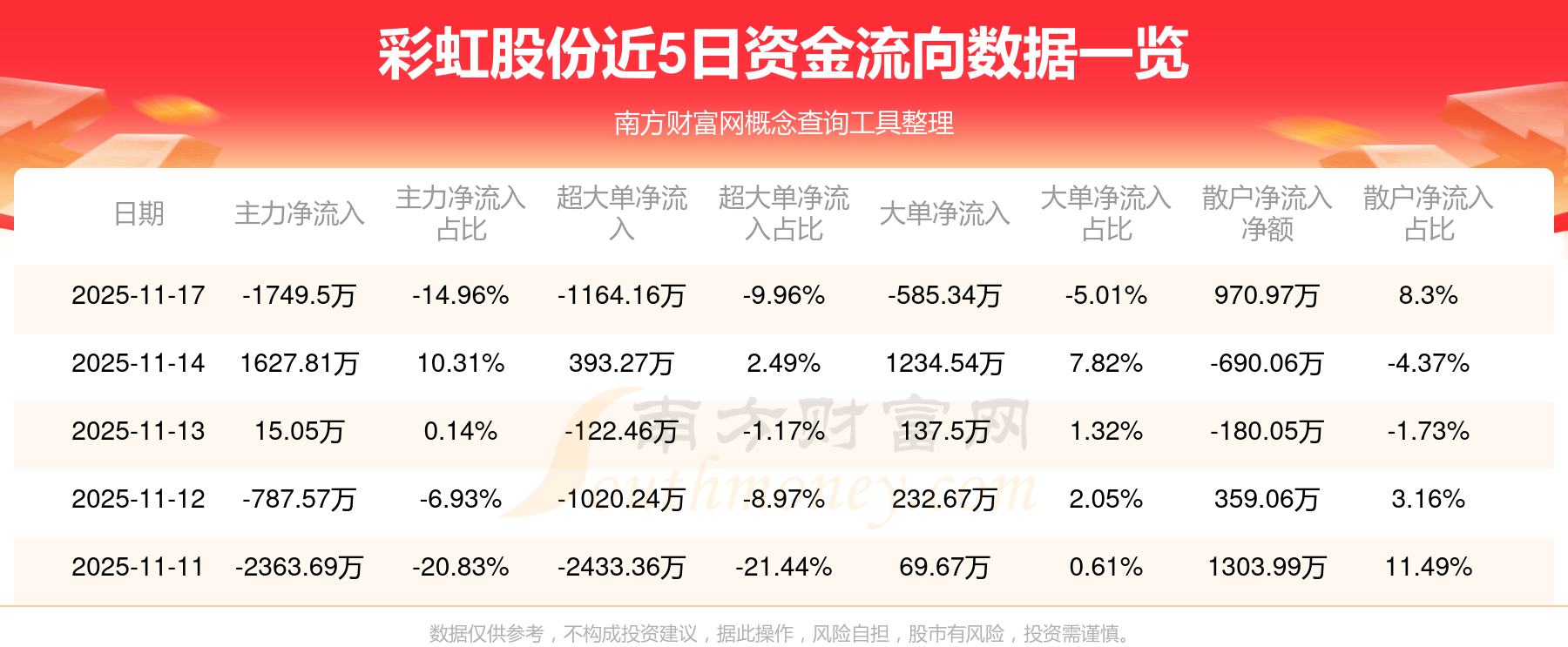 11月17日消息,彩虹股份资金净流出1749.5万元,超大单资金净流出1164.16万元,换手率0.55%,成交金额1.17亿元。