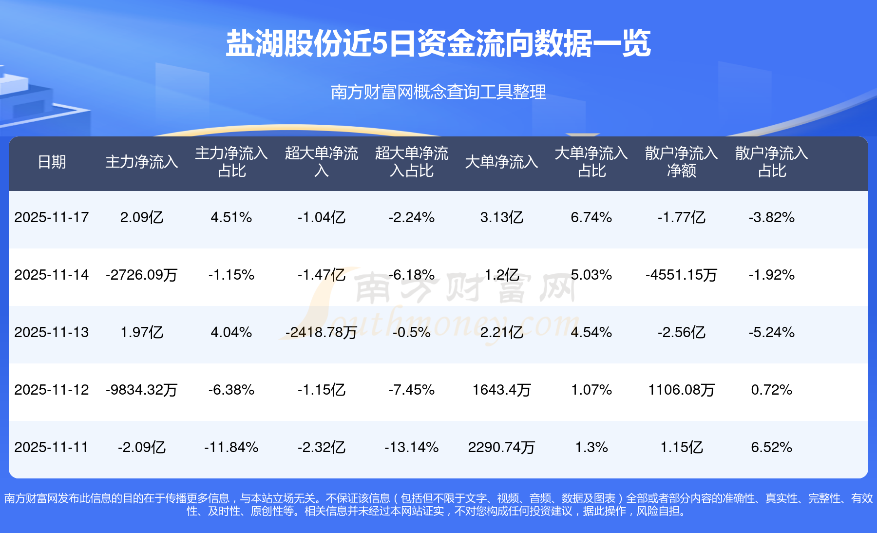 11月17日消息,盐湖股份主力净流入2.09亿元,超大单净流出1.04亿元,散户净流出1.77亿元。