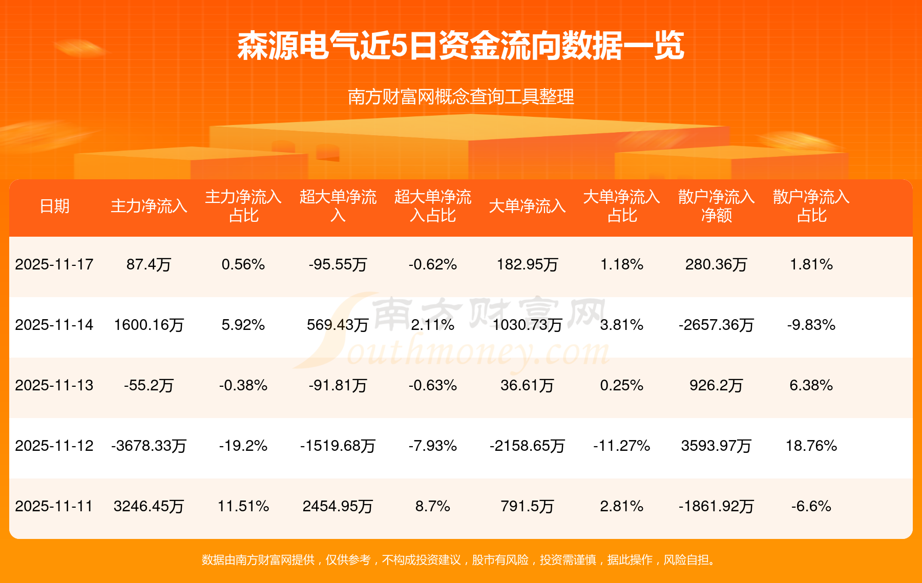 11月17日消息,森源电气主力净流入87.4万元,超大单净流出95.55万元,散户净流入280.36万元。