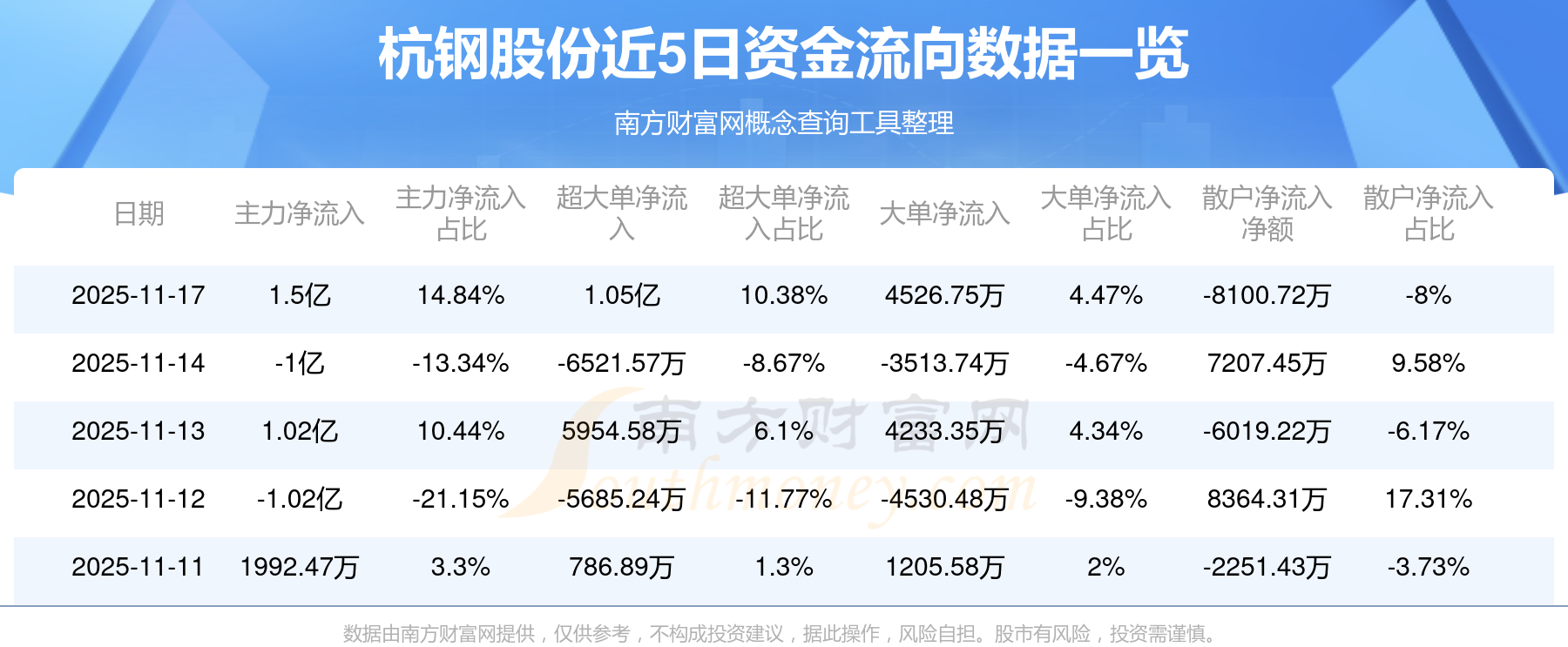 11月17日消息,杭钢股份主力资金净流入1.5亿元,超大单资金净流入1.05亿元,散户资金净流出8100.72万元。