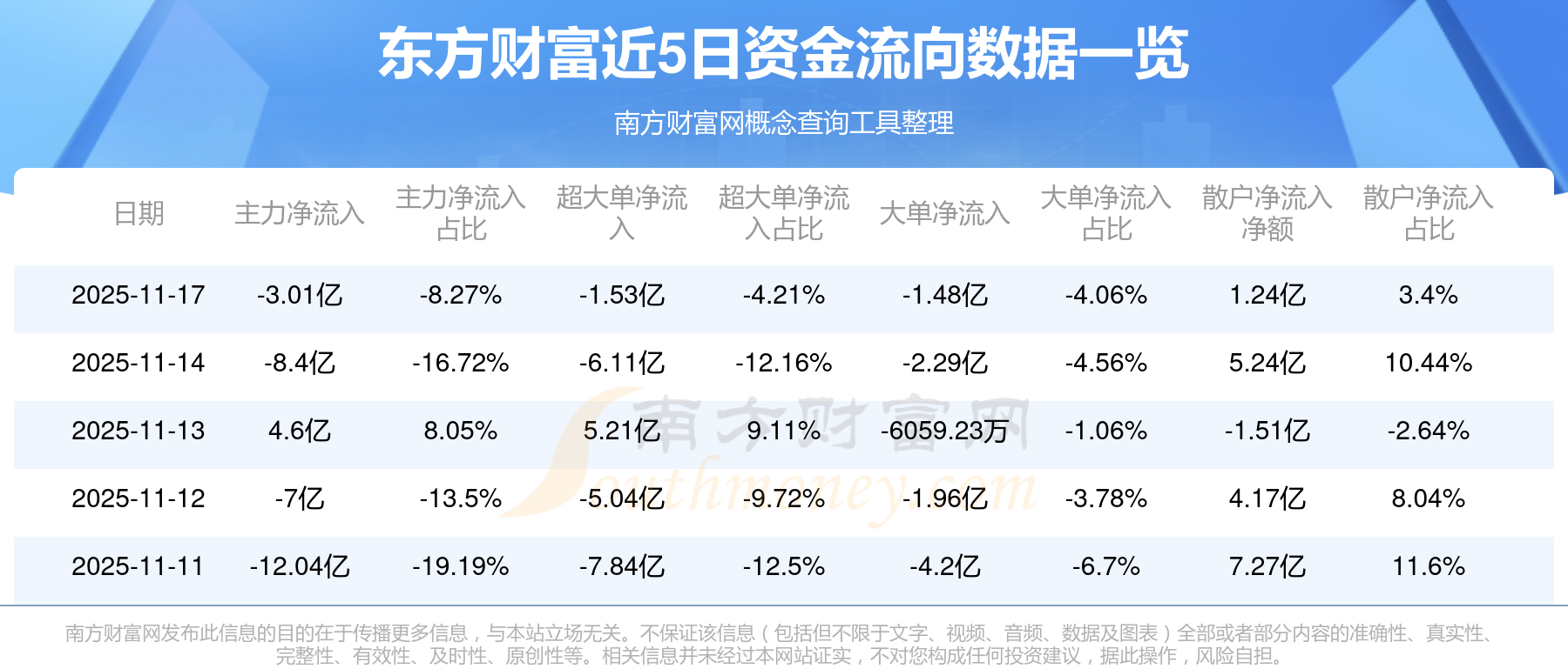 11月17日消息,东方财富资金净流出3.01亿元,超大单资金净流出1.53亿元,换手率1.11%,成交金额36.43亿元。