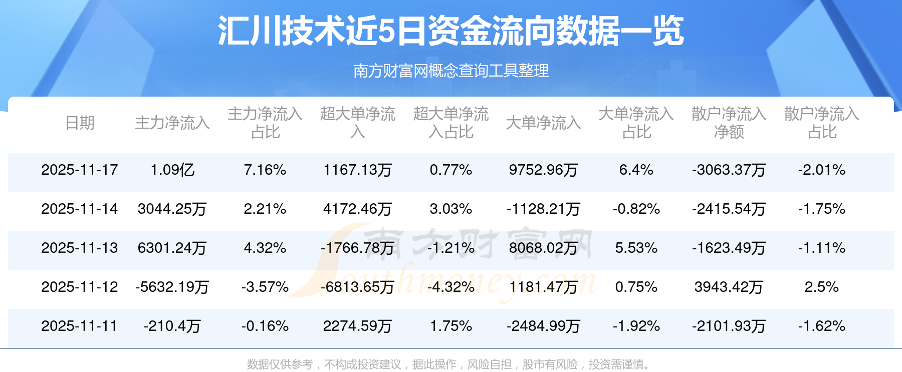 11月17日消息,汇川技术主力净流入1.09亿元,超大单净流入1167.13万元,散户净流出3063.37万元。