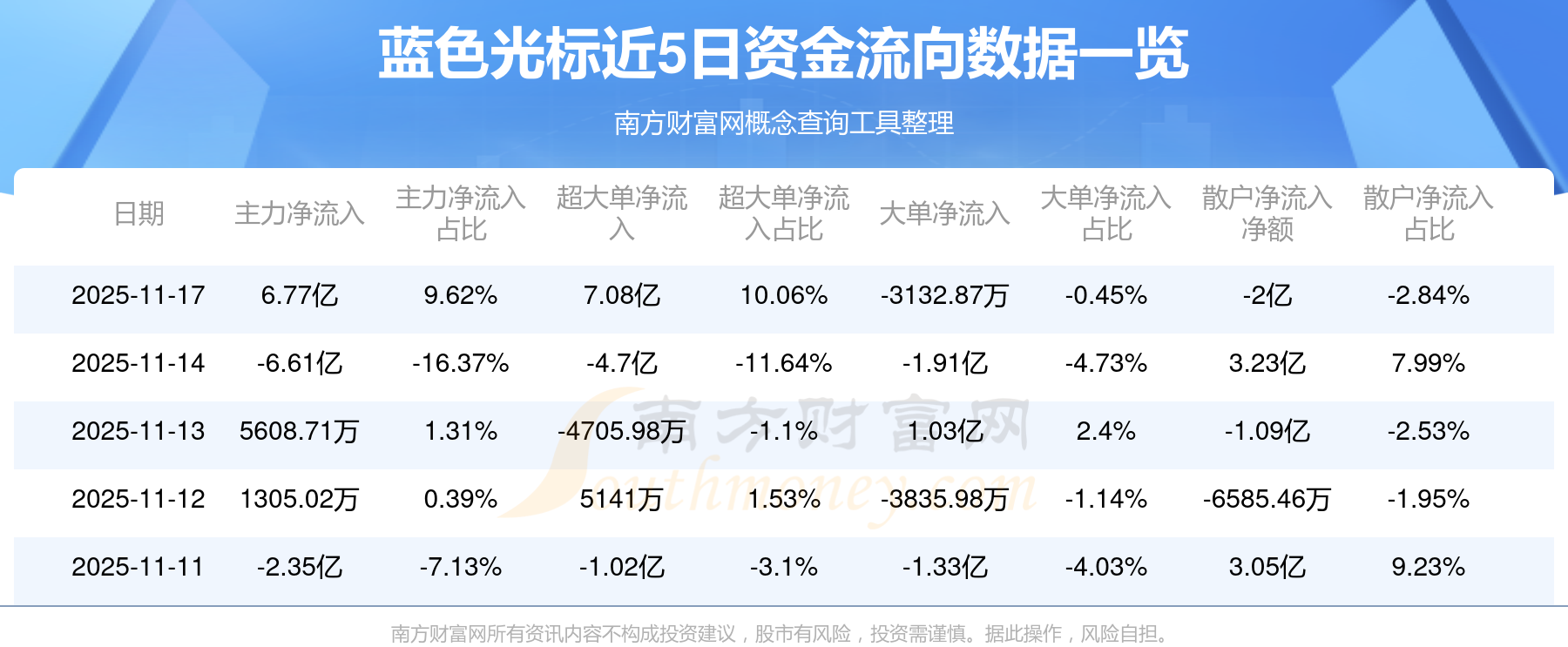 11月17日消息,蓝色光标11月17日主力净流入6.77亿元,超大单净流入7.08亿元,大单净流出3132.87万元,散户净流出2亿元。