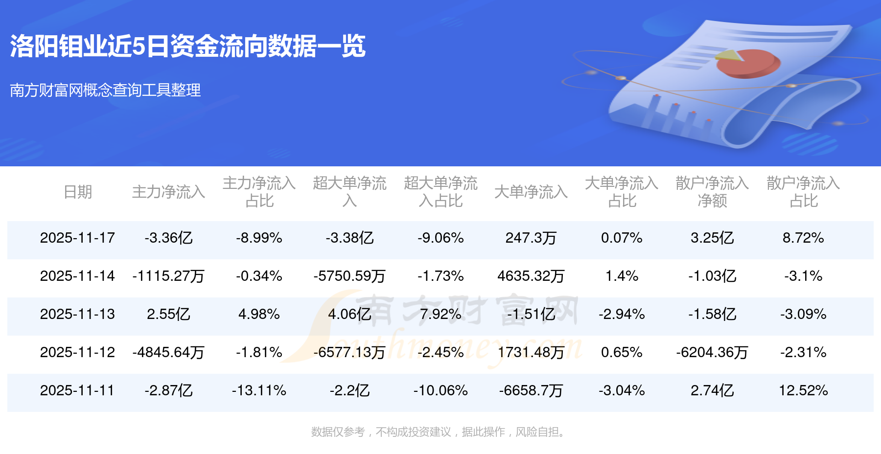 11月17日消息,洛阳钼业11月17日主力净流出3.36亿元,超大单净流出3.38亿元,大单净流入247.3万元,散户净流入3.25亿元。