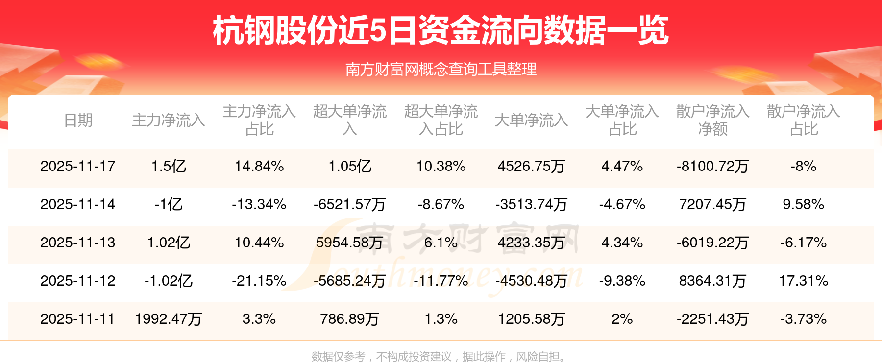 11月17日该股主力资金净流入1.5亿元,超大单资金净流入1.05亿元,大单资金净流入4526.75万元,中单资金净流出6935.93万元,散户资金净流出8100.72万元。