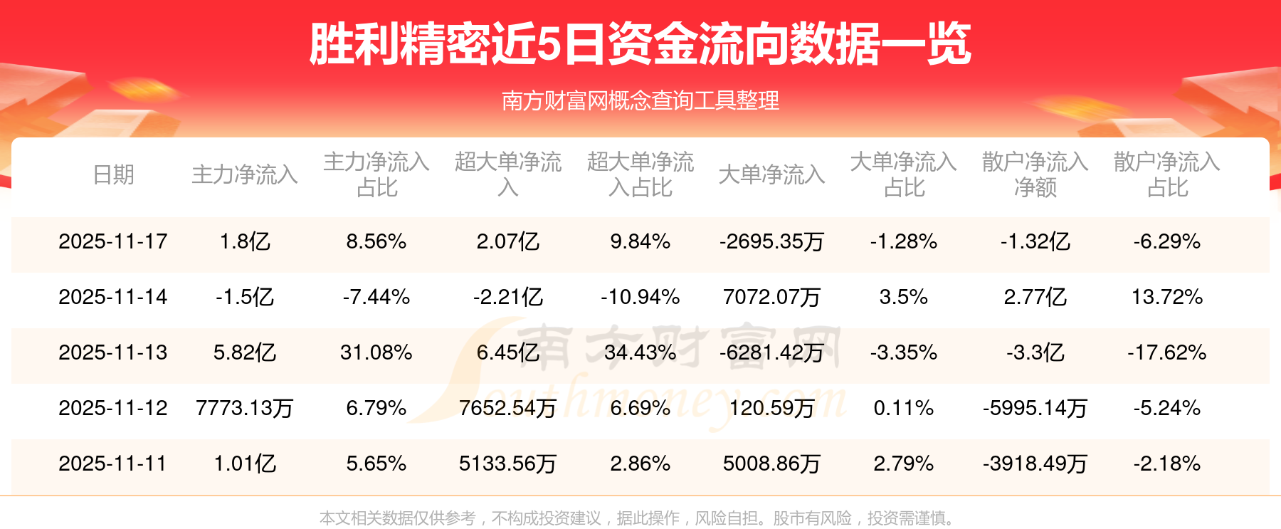 11月17日消息,胜利精密11月17日主力净流入1.8亿元,超大单净流入2.07亿元,大单净流出2695.35万元,散户净流出1.32亿元。