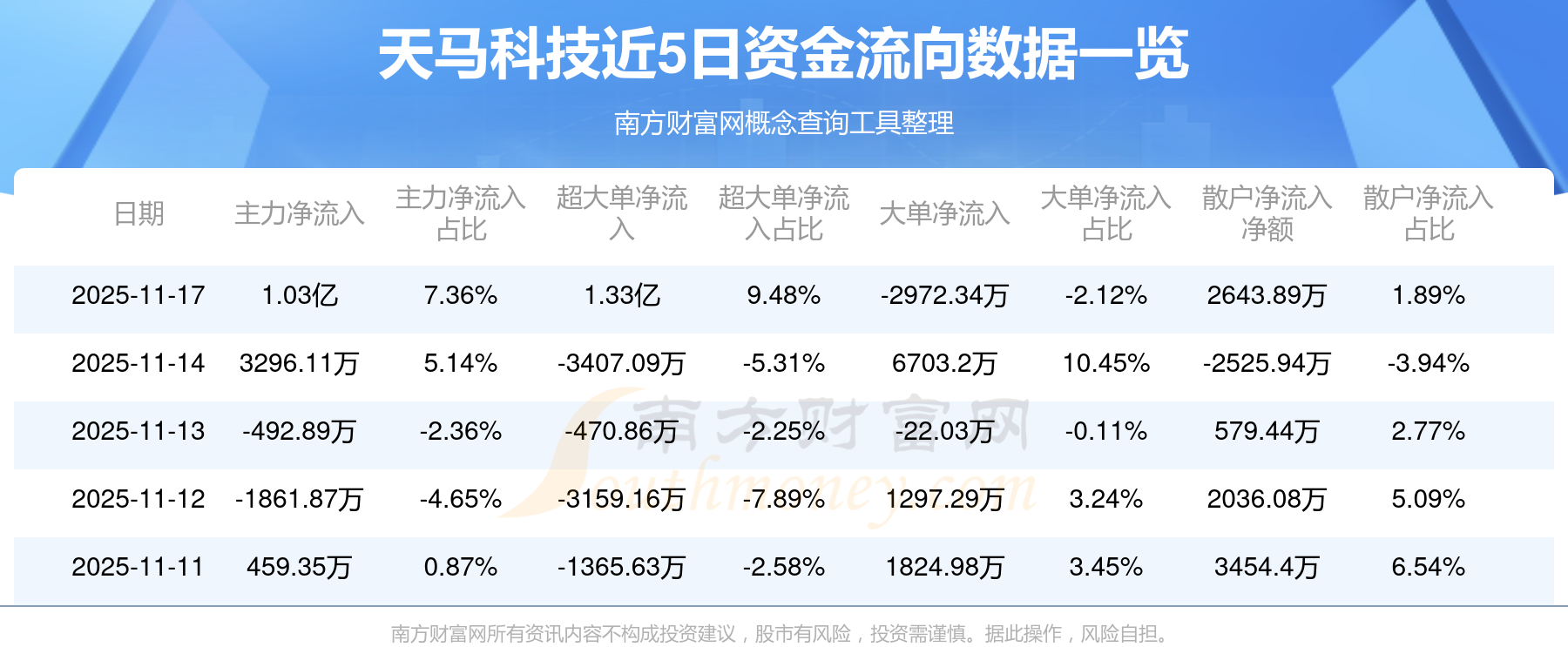 11月17日消息,天马科技主力资金净流入1.03亿元,超大单资金净流入1.33亿元,散户资金净流入2643.89万元。