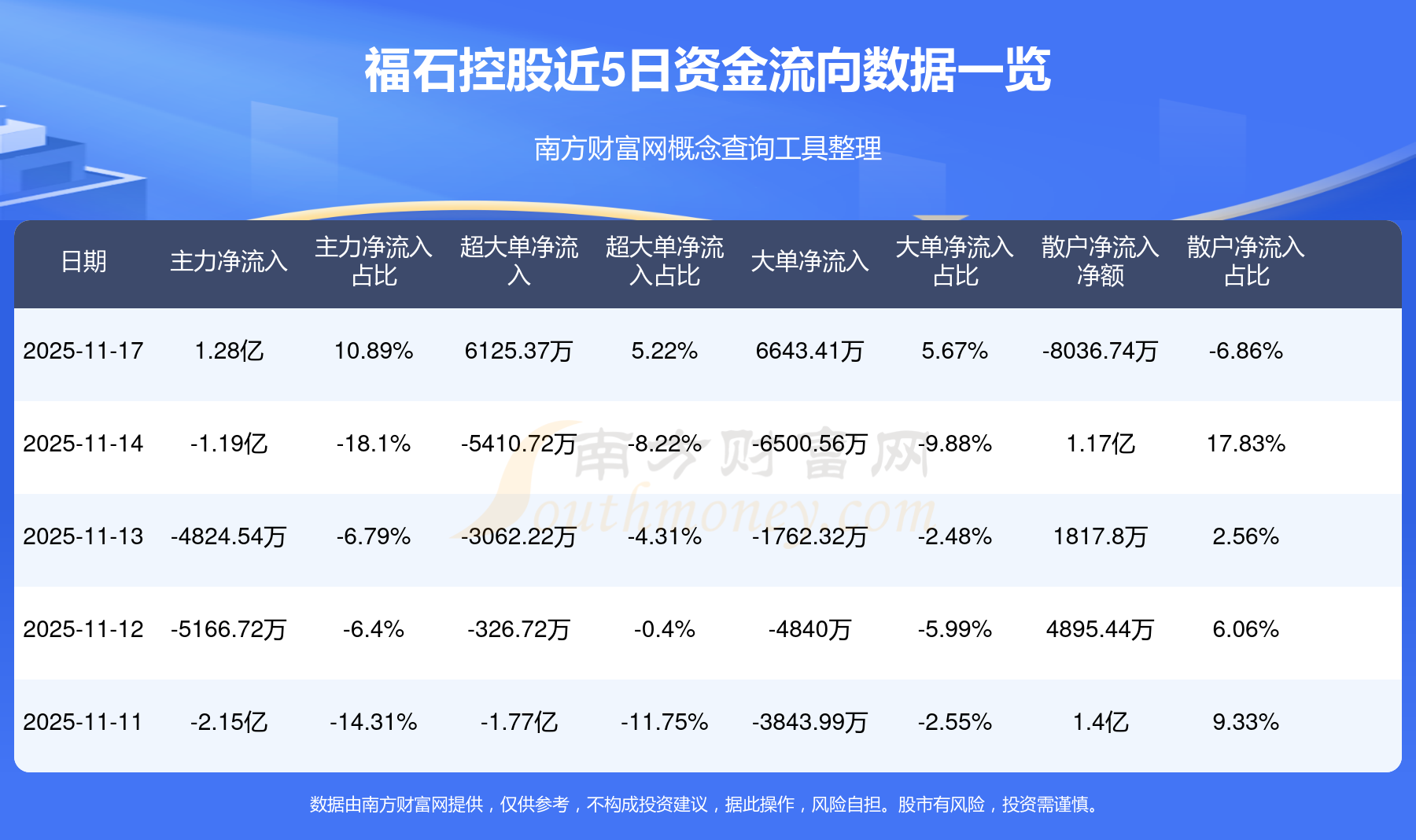 11月11日,福石控股开盘报6元,截至14时34分,报5.880元,成交额11.72亿元,换手率21.22%,市值为56.68亿元。