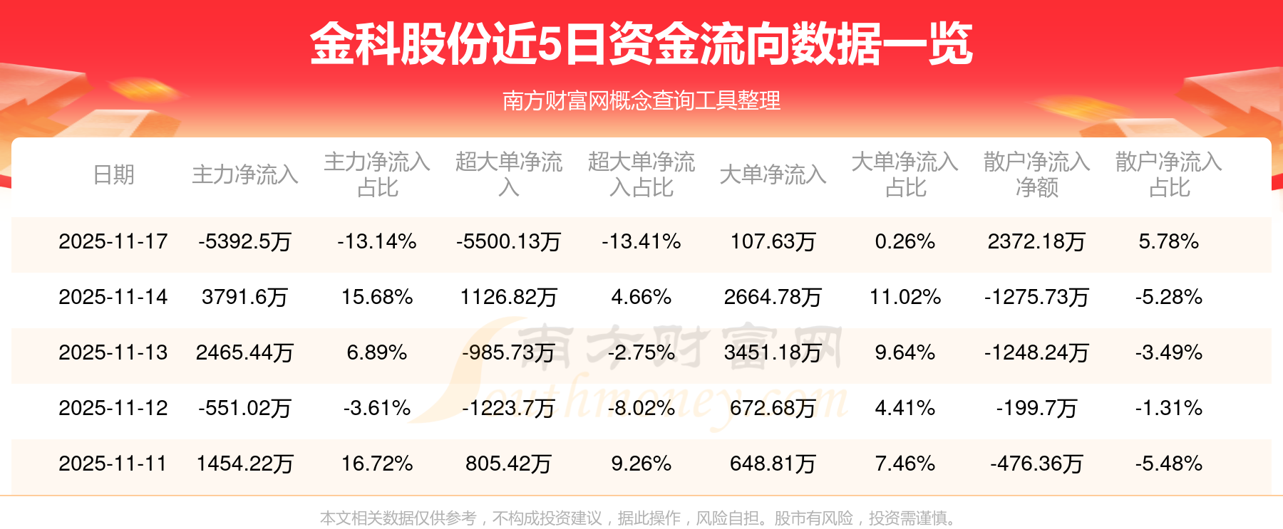 11月17日该股主力净流出5392.5万元,超大单净流出5500.13万元,大单净流入107.63万元,中单净流入3020.32万元,散户净流入2372.18万元。