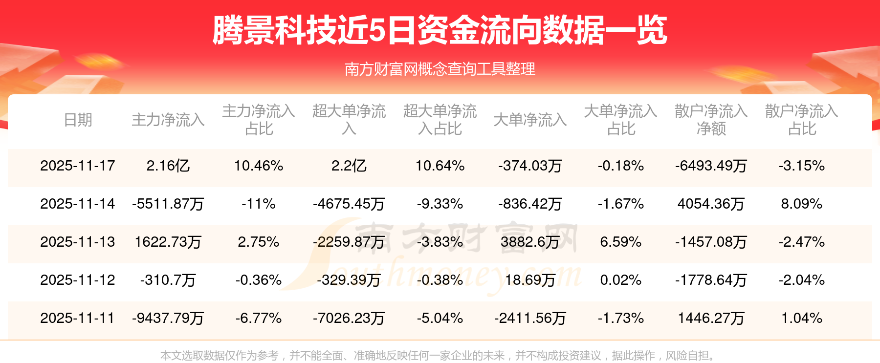 11月17日消息,腾景科技主力资金净流入2.16亿元,超大单资金净流入2.2亿元,散户资金净流出6493.49万元。