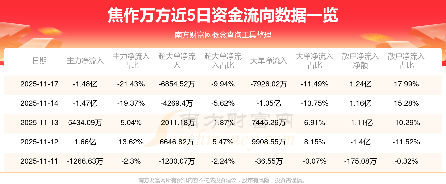 11月17日消息,焦作万方资金净流出1.48亿元,超大单资金净流出6854.52万元,换手率5.45%,成交金额6.9亿元。