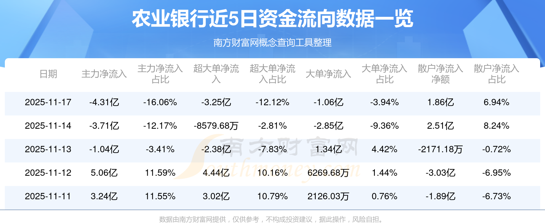 11月17日消息,农业银行资金净流出4.31亿元,超大单资金净流出3.25亿元,成交金额8034.32万元。