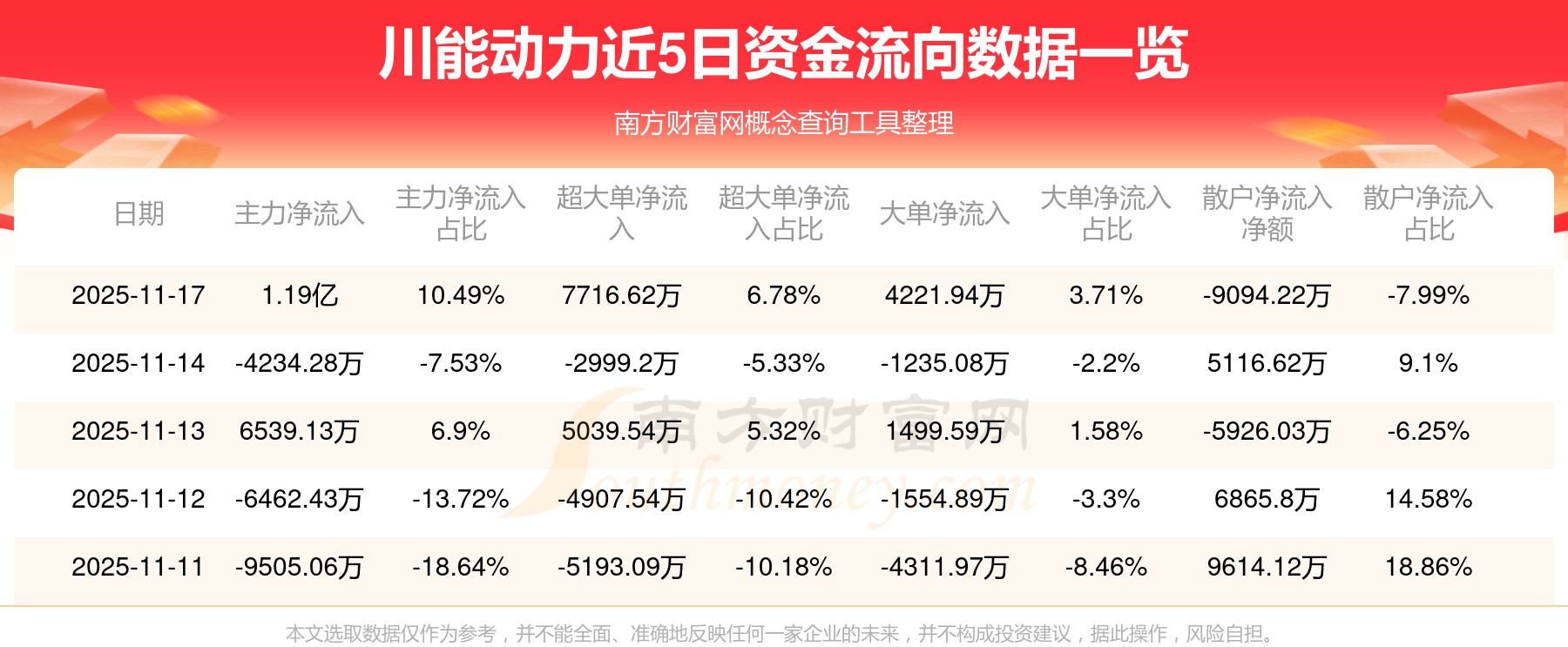 11月17日消息,川能动力11月17日主力净流入1.19亿元,超大单净流入7716.62万元,大单净流入4221.94万元,散户净流出9094.22万元。