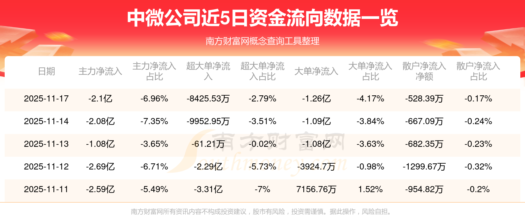 11月17日消息,中微公司11月17日主力资金净流出2.1亿元,超大单资金净流出8425.53万元,大单资金净流出1.26亿元,散户资金净流出528.39万元。