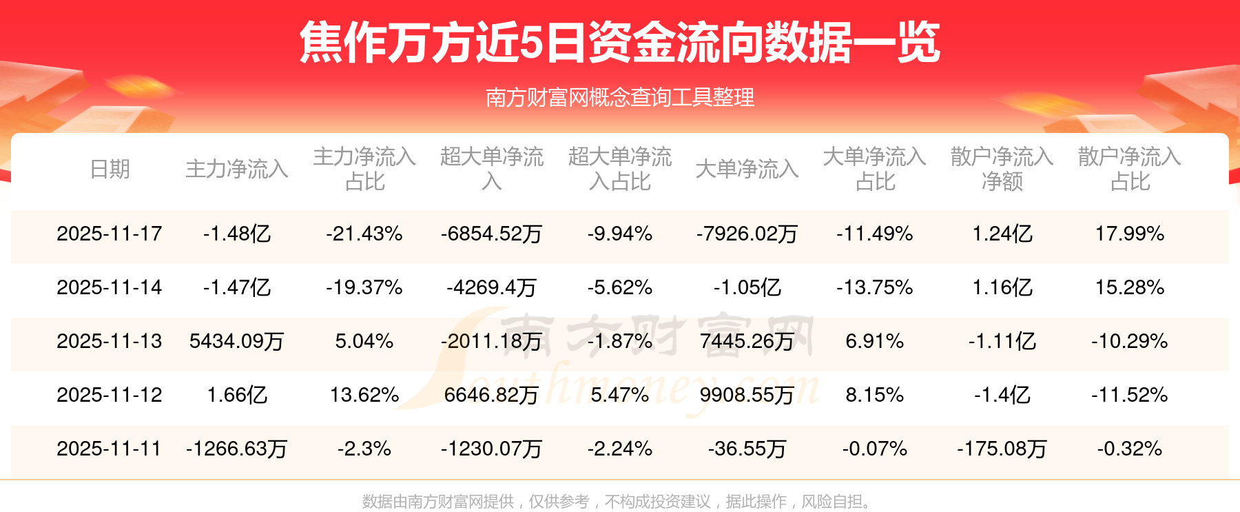 11月17日消息,焦作万方11月17日主力净流出1.48亿元,超大单净流出6854.52万元,大单净流出7926.02万元,散户净流入1.24亿元。