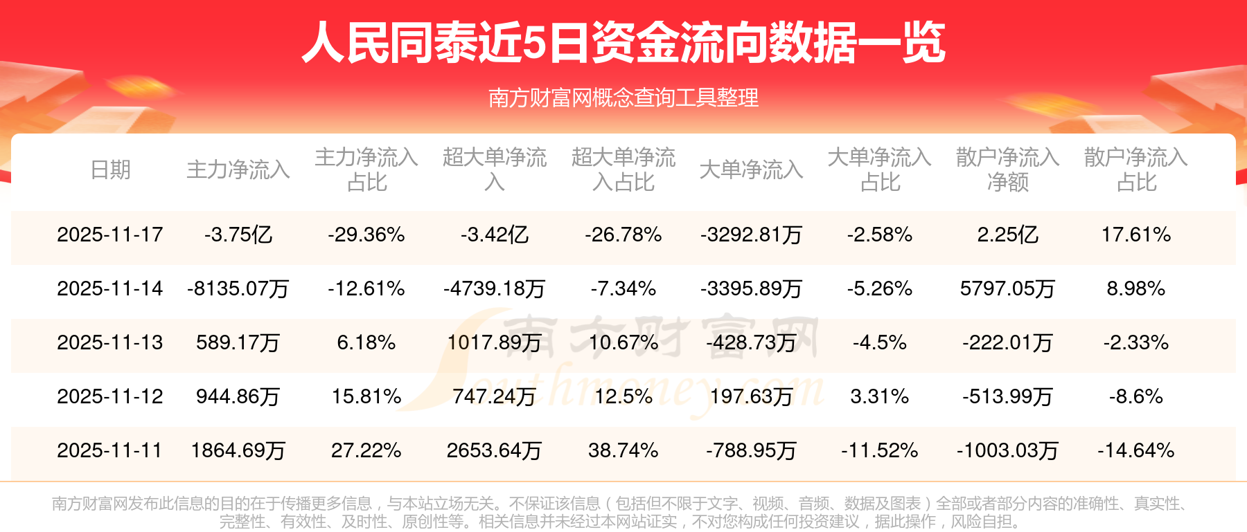 11月17日消息,人民同泰主力资金净流出3.75亿元,超大单资金净流出3.42亿元,散户资金净流入2.25亿元。