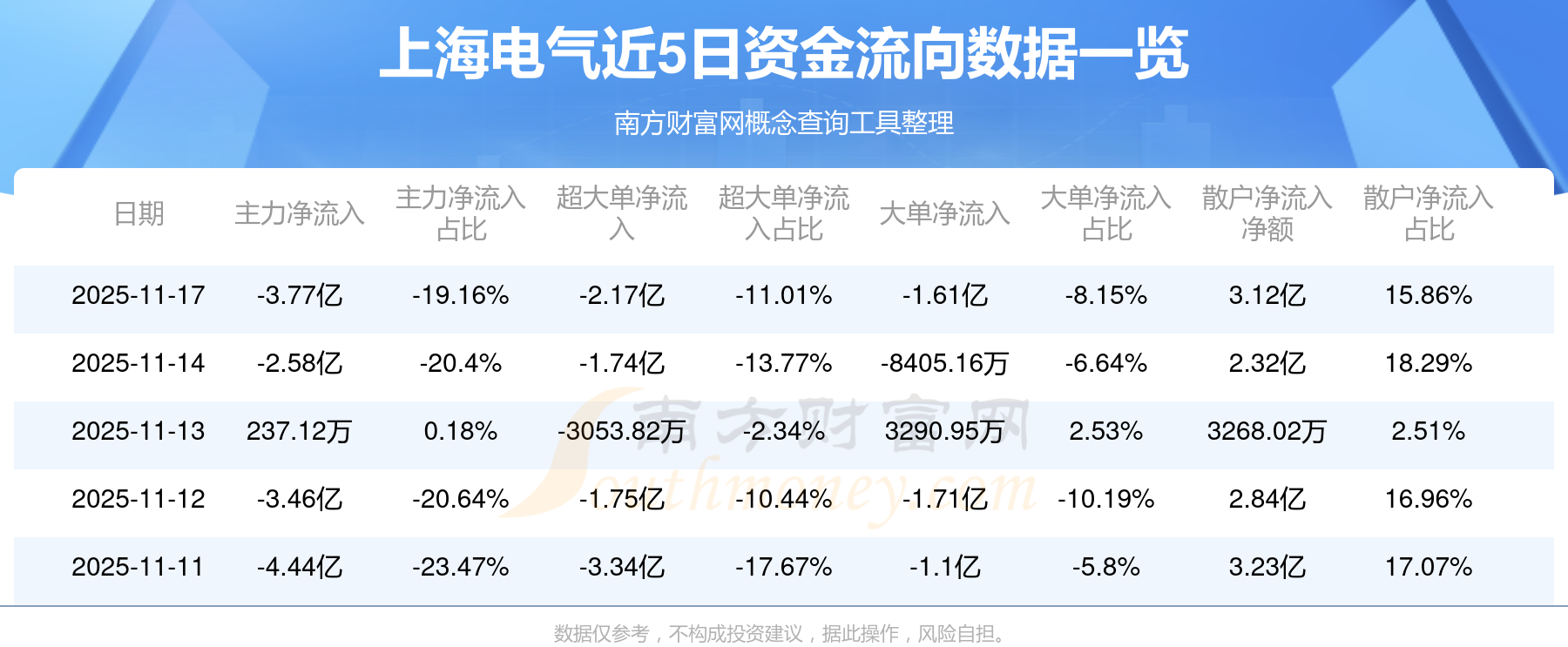 11月17日消息,上海电气11月17日主力净流出3.77亿元,超大单净流出2.17亿元,大单净流出1.61亿元,散户净流入3.12亿元。