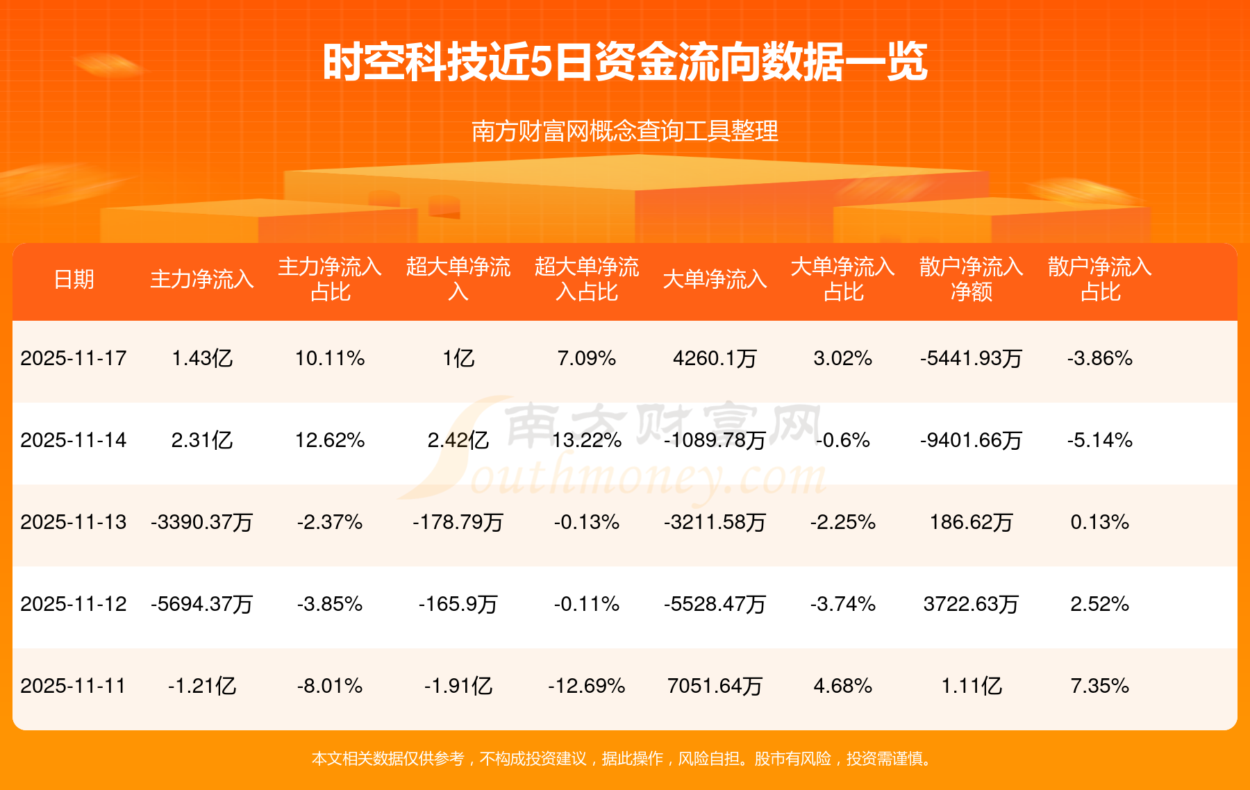 11月17日消息,时空科技资金净流入1.43亿元,超大单资金净流入1亿元,换手率9.86%,成交金额7.91亿元。
