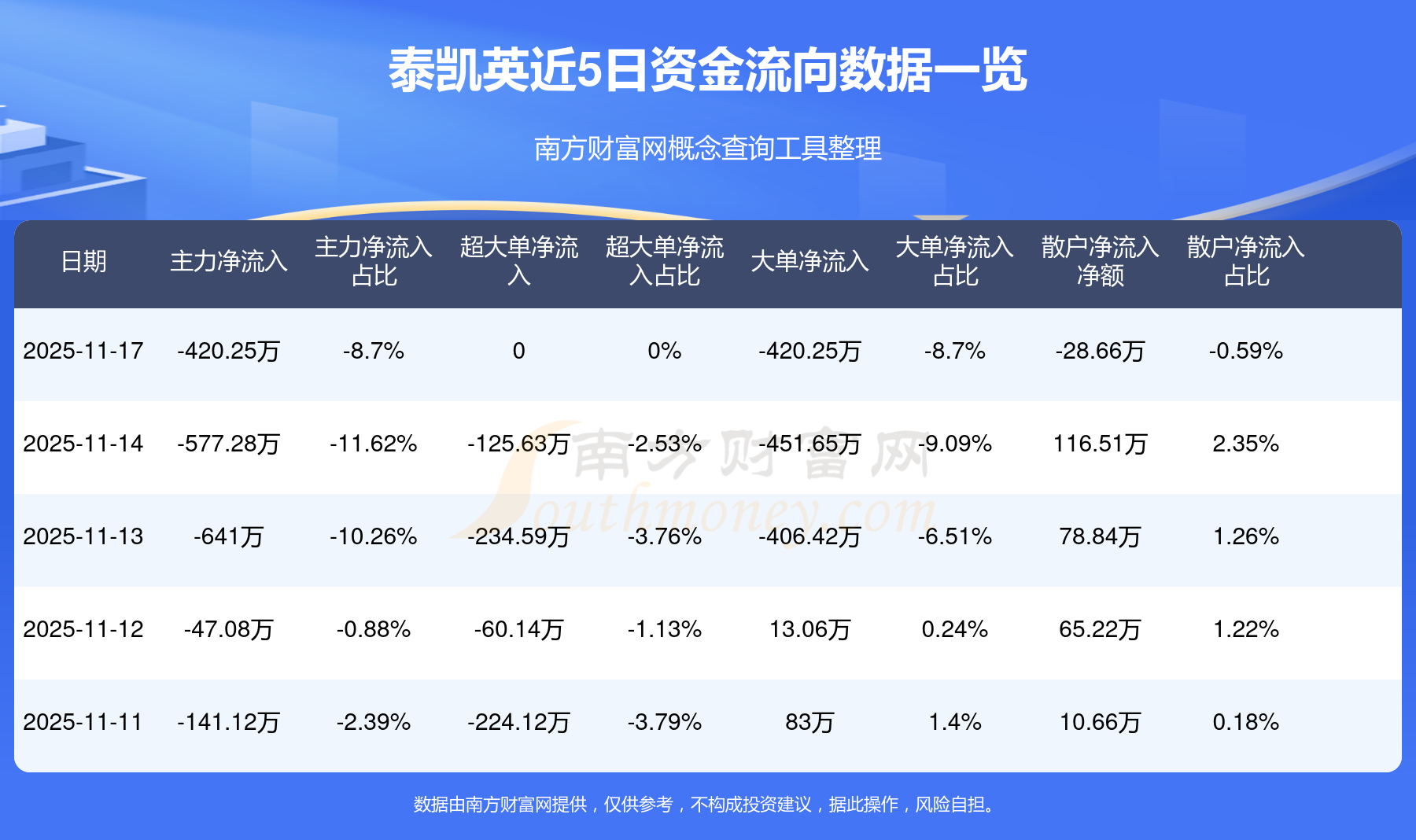 11月17日该股主力净流出420.25万元,大单净流出420.25万元,中单净流出676.92万元,散户净流出28.66万元。