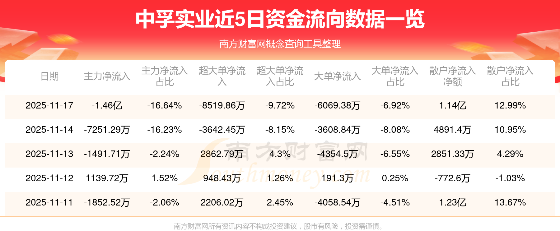 11月17日该股主力资金净流出1.46亿元,超大单资金净流出8519.86万元,大单资金净流出6069.38万元,中单资金净流入3195.3万元,散户资金净流入1.14亿元。