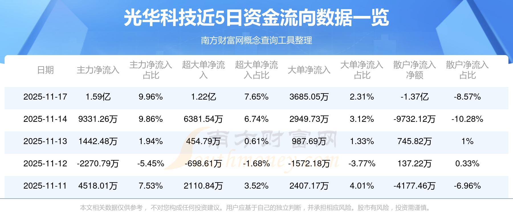 11月17日消息,光华科技资金净流入1.59亿元,超大单资金净流入1.22亿元,换手率9.66%,成交金额10.05亿元。