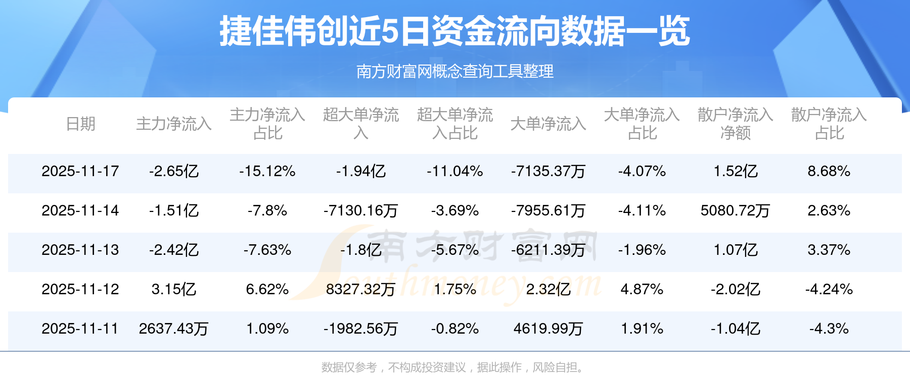 11月17日消息,捷佳伟创11月17日主力净流出2.65亿元,超大单净流出1.94亿元,大单净流出7135.37万元,散户净流入1.52亿元。