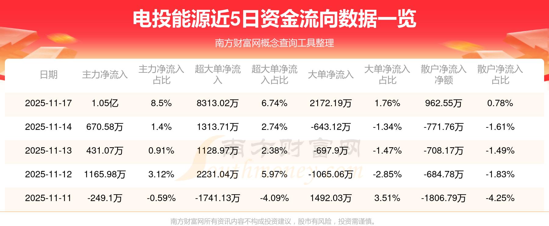 11月17日消息,电投能源资金净流入1.05亿元,超大单净流入8313.02万元,换手率0.83%,成交金额5.03亿元。